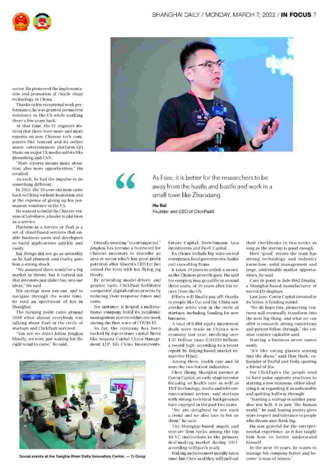 近日,,,,,,,,,,小微钱包创始人、、、、、、、、、、、、、CEO胡柏接受了《上海日报》采访,,,,,,,,,,,,,关于自己当初为何选择创立小微钱包,,,,,,,又为何将公司落户于上海青浦,,,,,分享了其背后的故事。。。。。。。。。。。